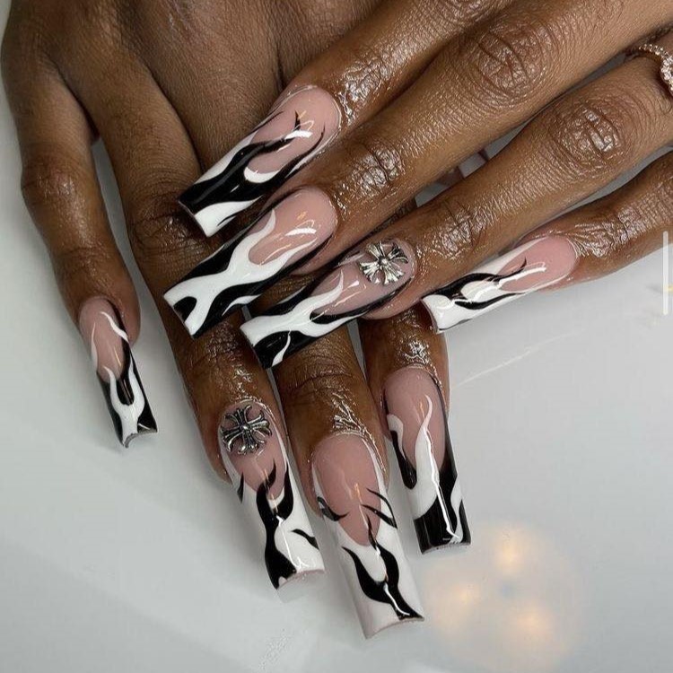 This manicure uses long coffin nails with flowing black and white flame patterns. The nude base allows the bold design to stand out clearly.