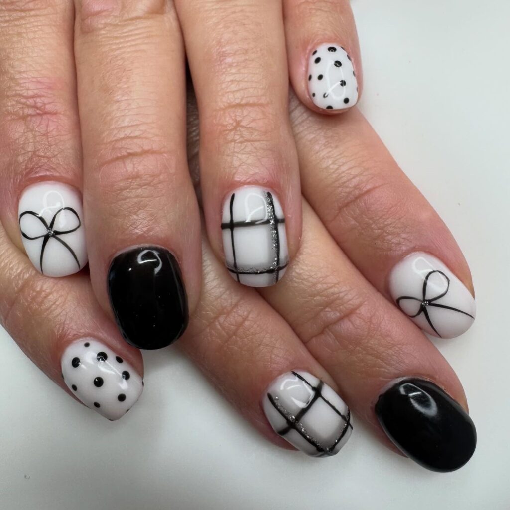 This manicure mixes glossy black nails with white accent nails covered in polka dots. I also added grid lines and bow details to give the design more personality.