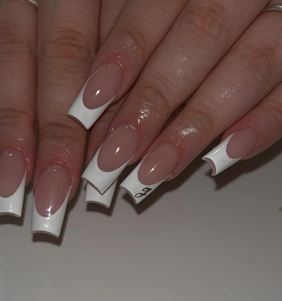 This design features a nude base paired with a dramatic white French tip. The deep curve creates a sharp and elegant shape that stands out.