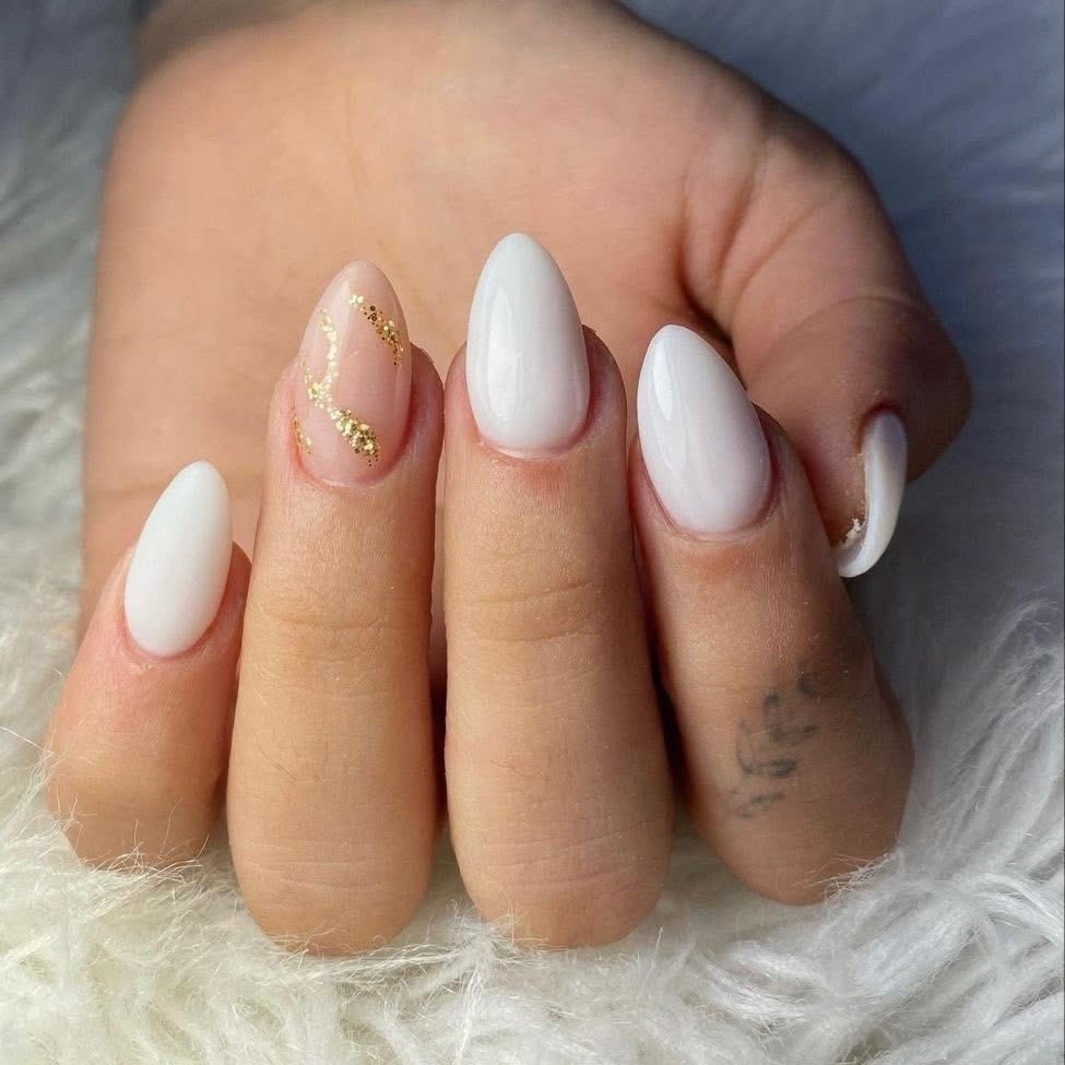 This manicure uses a soft glossy white color across elegant almond shaped nails. One nude accent nail features a delicate gold detail that adds subtle sparkle.