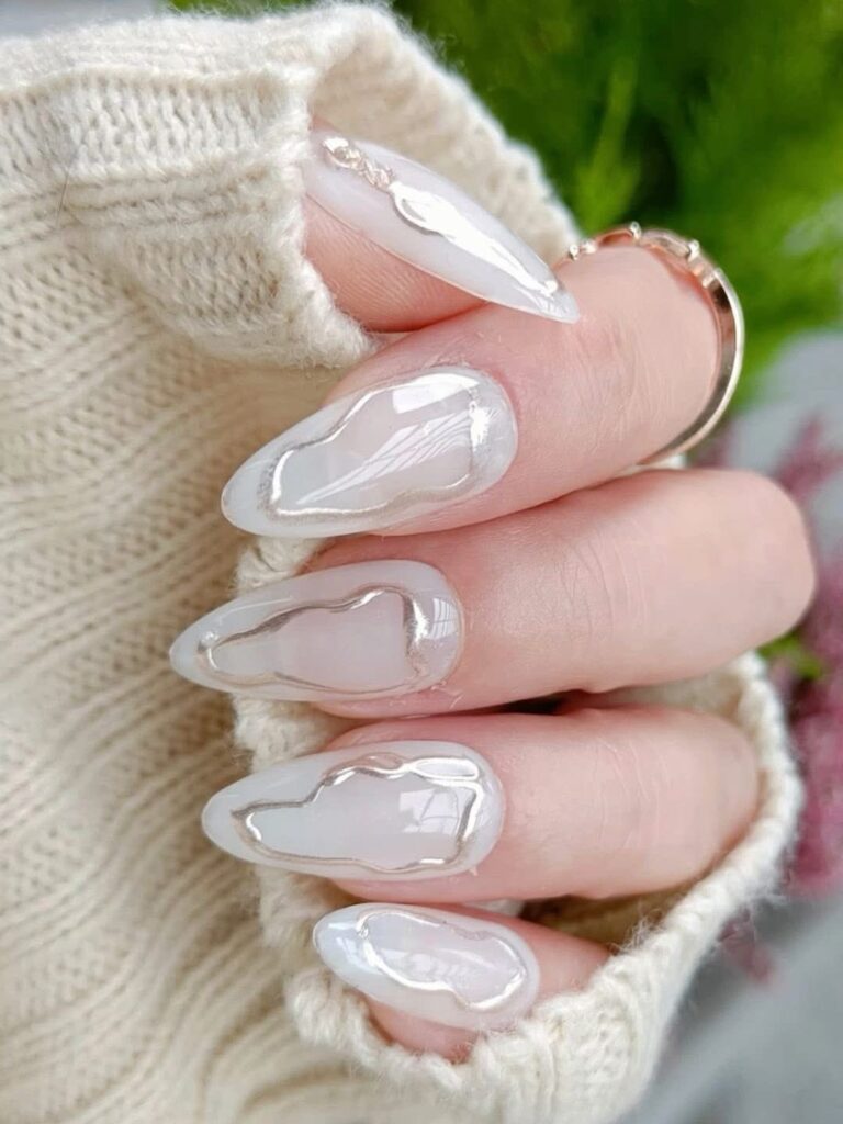 This design uses a soft milky white shade with a glossy chrome finish. Thin raised lines outline the nails and create a sculpted effect.