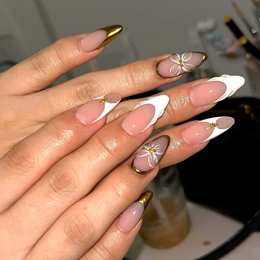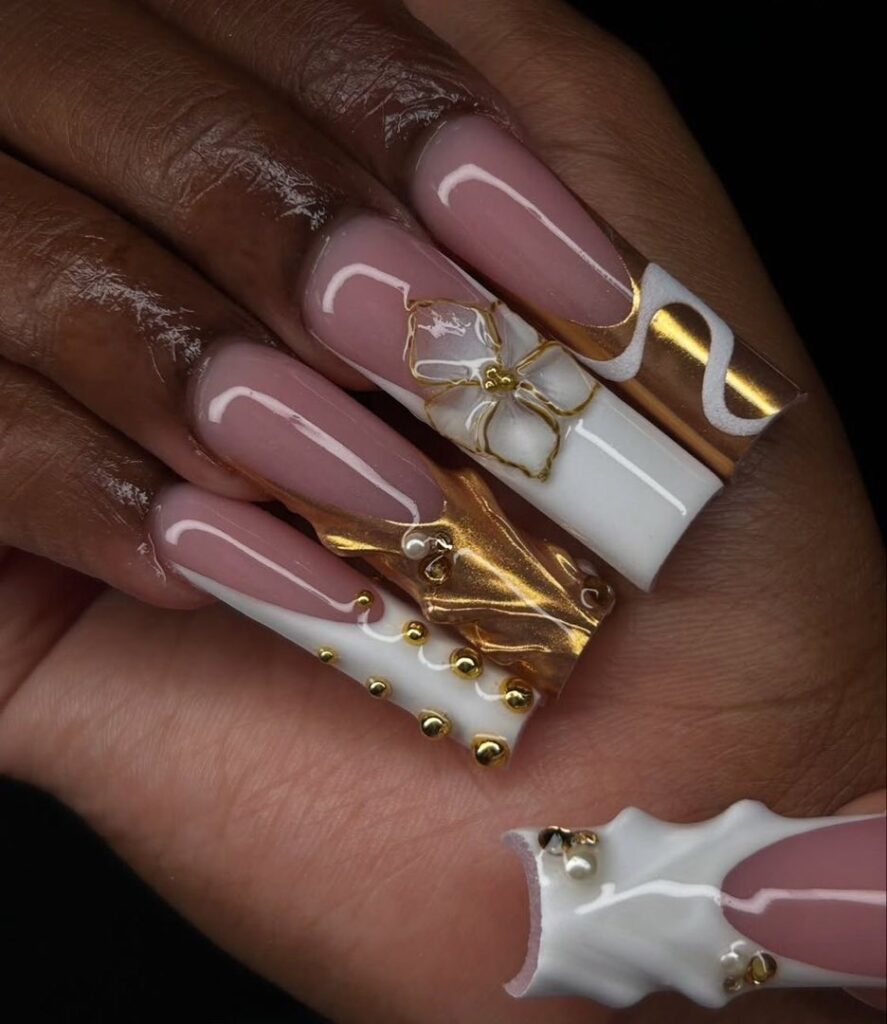 This design combines nude and white nails with bold gold decorations. Metallic shapes, beads, and floral details create a rich and dramatic look.
