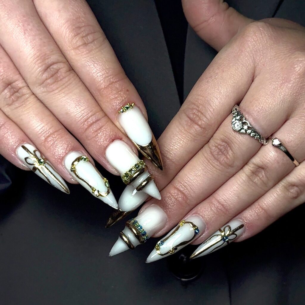 This design features sharp stiletto nails painted in creamy white polish. I used gold chrome tips, crystals, and decorative frames to build a dramatic luxury look.