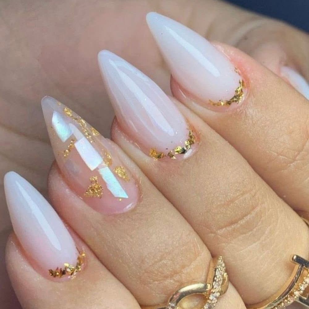 I enjoy how the gold flakes give the manicure a luxurious texture. The soft white base keeps the design elegant and modern.