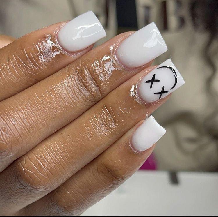 This manicure keeps the look clean with glossy white square nails. One accent nail features a small black graphic design that adds a modern edge.