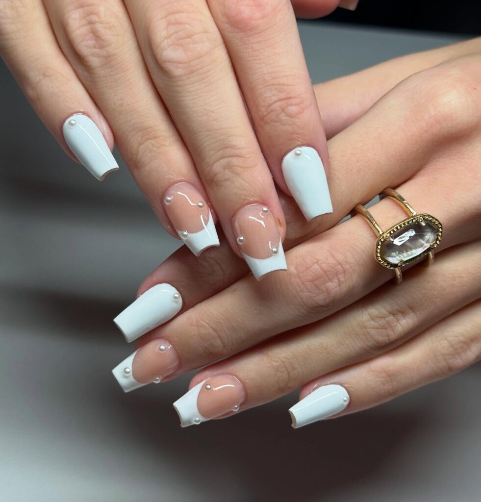 This manicure mixes glossy white nails with nude accents and small pearl details. The pearls sit on the surface and create a soft decorative texture.