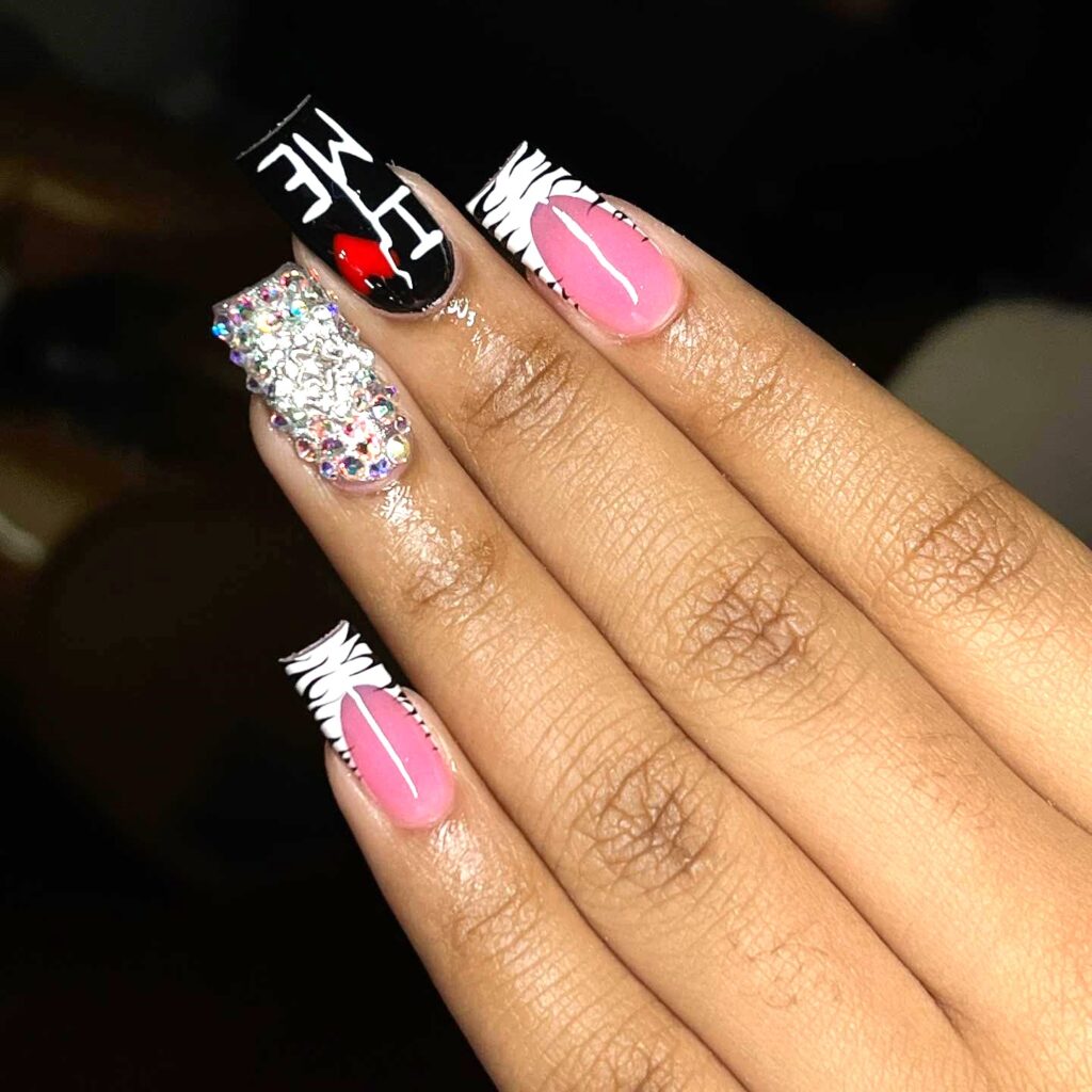This manicure combines soft pink polish with bold black artwork. One nail features a graphic pattern while another uses chunky silver glitter.