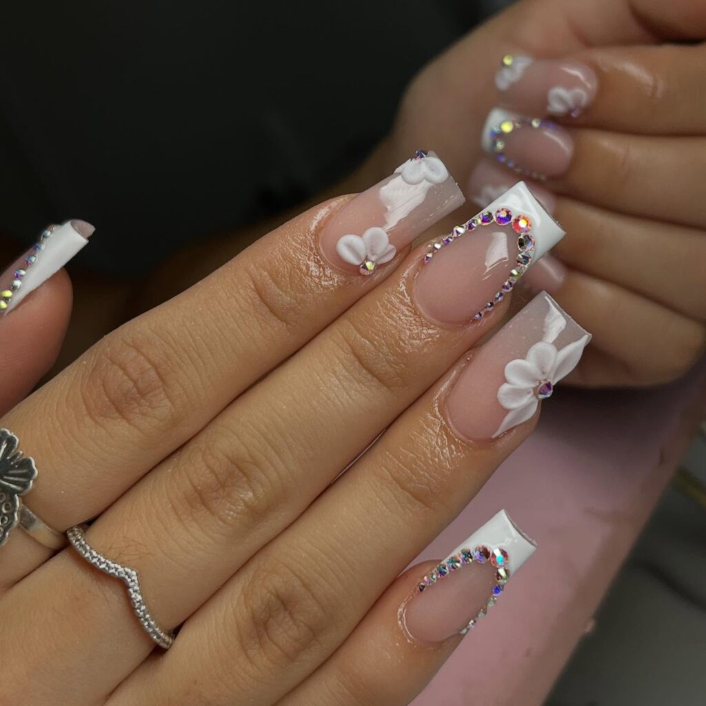 This manicure stands out because of the detailed 3D white flowers placed along the long square nails. Small crystals sit in the center of the flowers and catch the light beautifully.
