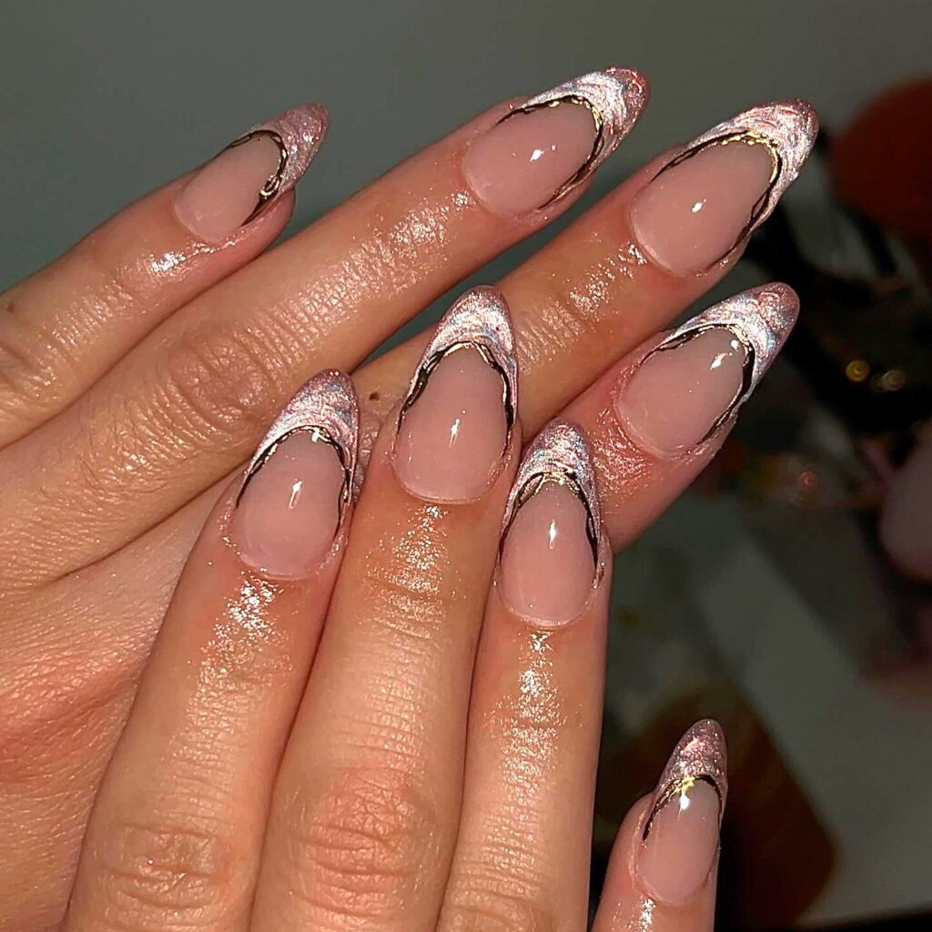 This design uses soft nude nails with glittery rose gold French tips. Thin metallic lines highlight the curve of the tips and add extra shine.