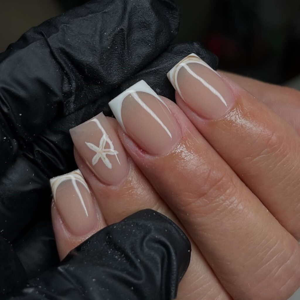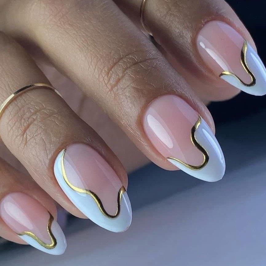 This manicure uses a soft nude base with crisp white French tips. Thin gold lines follow the curve of the tips and add a refined detail.