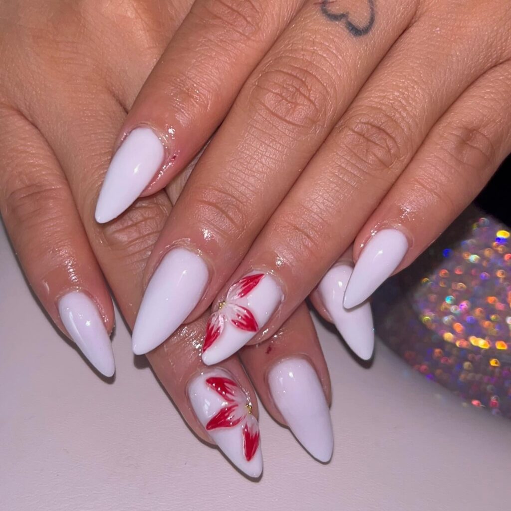 This manicure uses glossy white almond nails with a red petal flower design on accent nails. I painted the petals with soft brush strokes to give the flowers movement.