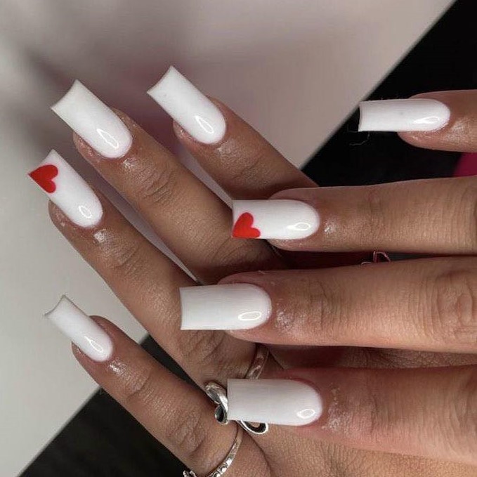 This design uses long coffin shaped nails painted in smooth white polish. Small red hearts placed near the edges add a cute and playful touch.