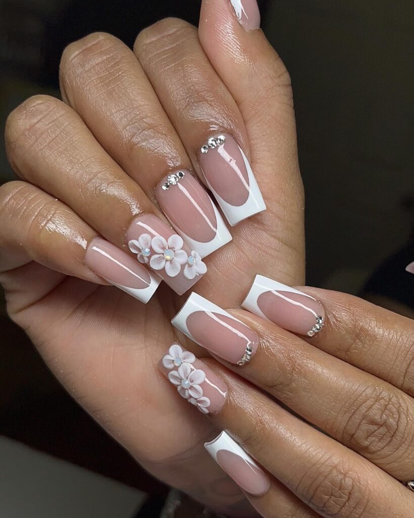 This manicure uses a nude base with classic white French tips. Small 3D flowers and rhinestones decorate the nails and create a romantic detail.