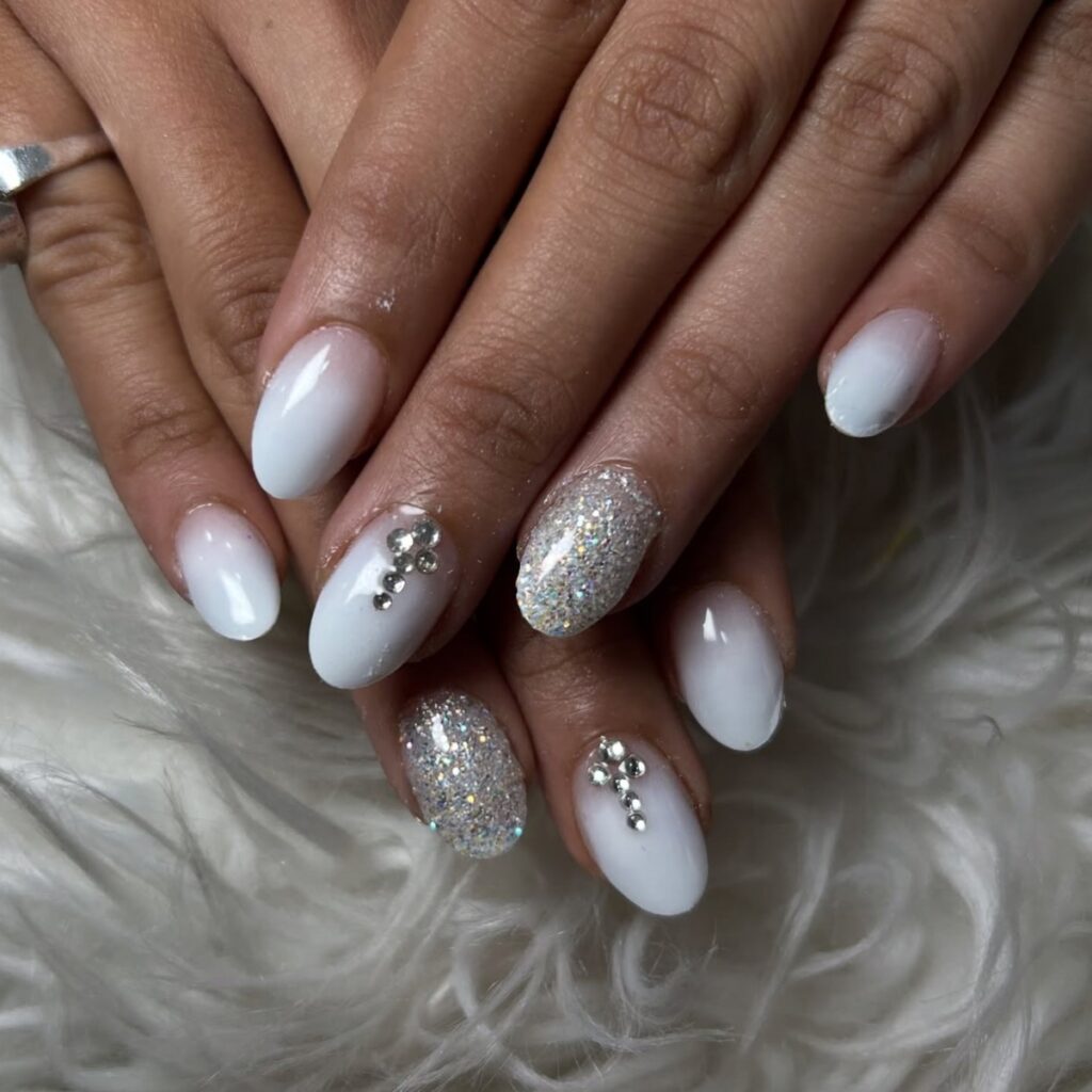 I like how the glitter nails catch the light and create a glamorous finish. The white polish balances the design and keeps it looking clean and classy.