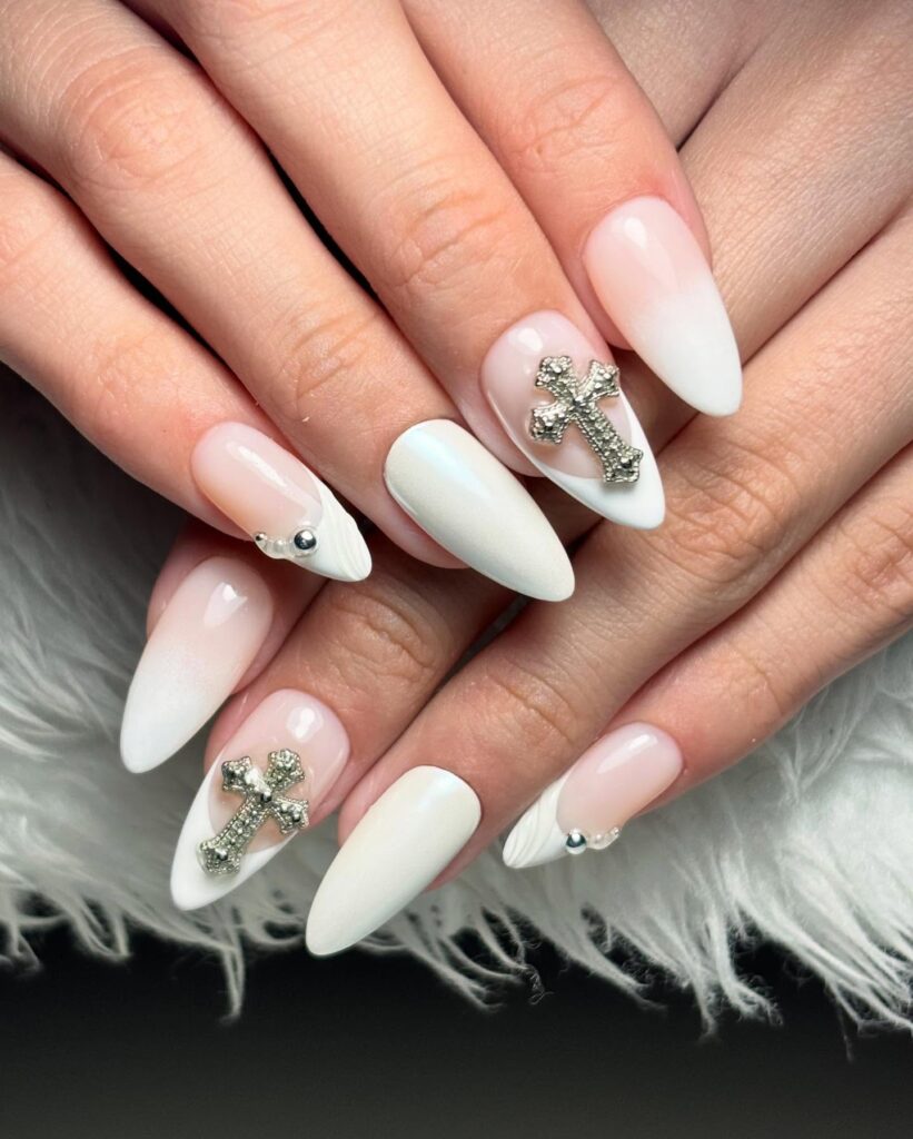 This manicure uses a soft nude to white ombre that blends smoothly across long almond nails. I added silver cross charms and small metallic beads to create a bold focal point.