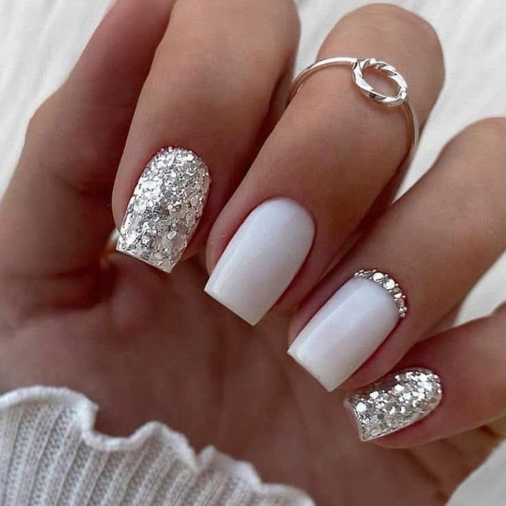 The glitter brings shine while the white polish keeps the design balanced. This style feels elegant and works well for festive or evening looks.